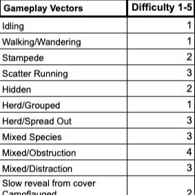 I use a lot of different tools to help the level designers build their hunts so that they are able stretch their imaginations yet remain within the overall design direction for Deer Hunter World. We brainstormed and came up with an extensive list of gameplay vectors with the combination of animal behaviors, weapon types, and environmental factors could help us create an endless number of hunts. More importantly, we could design levels with specific, known difficulties built in.