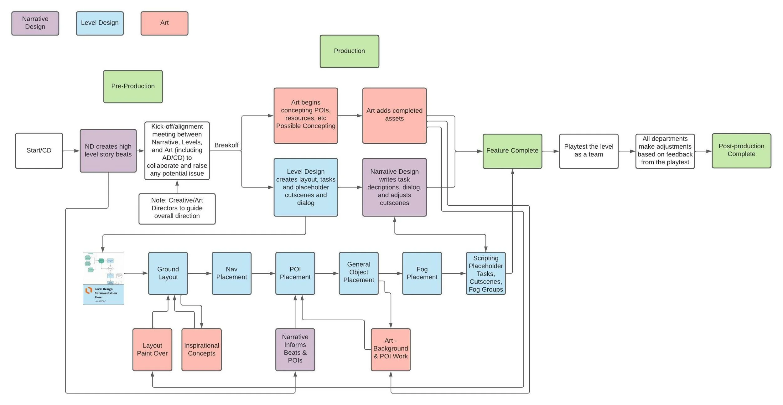 This flow chart depicts how a level is created in collaboration with narrative design and art. Stakeholders are brought in early to approve the general direction of a level and then a kickoff is created to official begin work on the level. At varying points in development, narrative design or art will interject with their work and input.