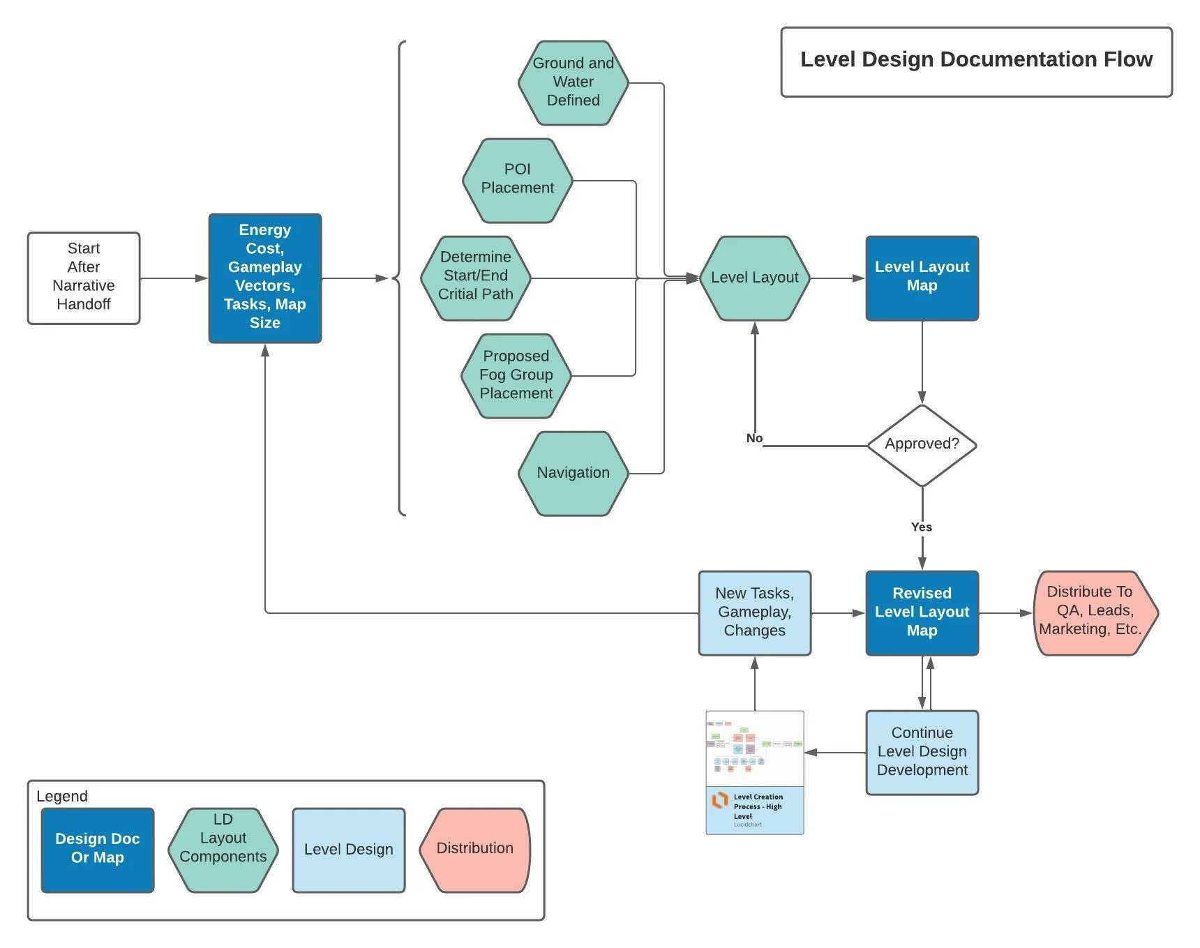 The Level Design Documentation Flow was created to ensure that level design documentation was consistent from level to level and to prevent any slips through the crack on any features. Frequent reviews made sure all areas and phases of the level creation process was accounted for.